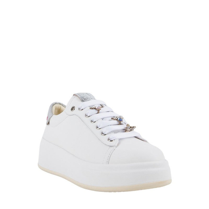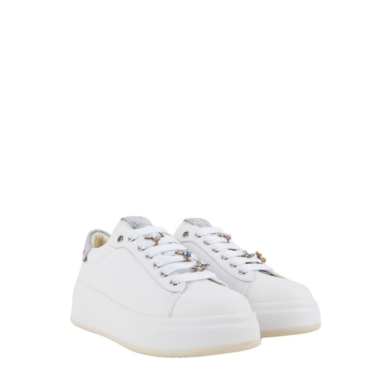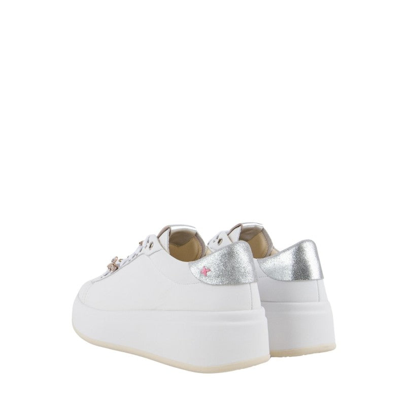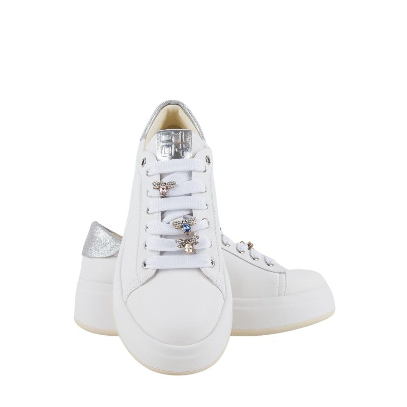 Caratterizzata da occhielli in argento , targhetta sulla linguetta con il logo laminato argento e sono applicati accessori passalaccio a forma di ape,lacci piatti in cotone.