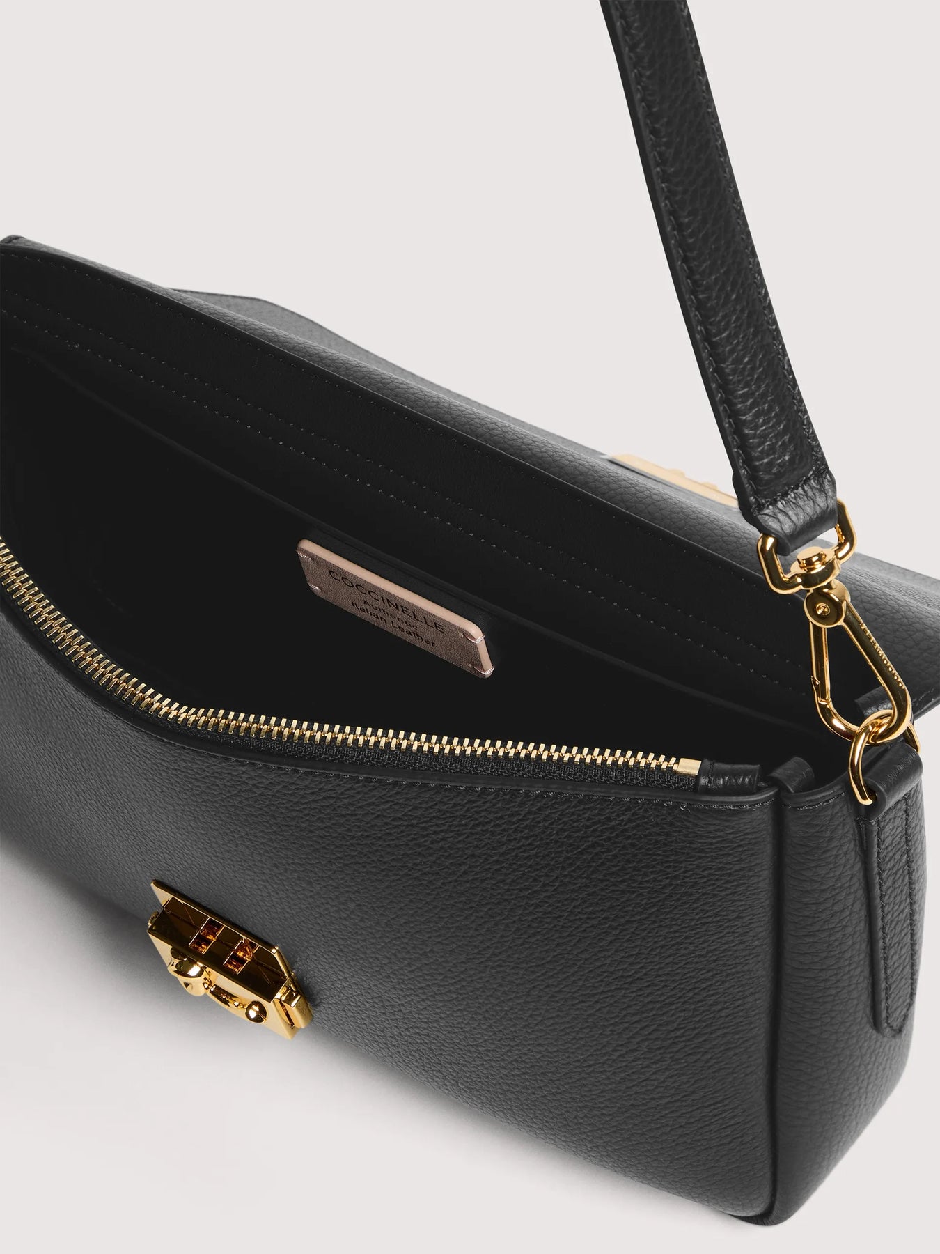 La linea Coccinelle C-Me Lock rappresenta un’evoluzione raffinata del logo C-Me, reinterpretato in una chiusura moderna e distintiva che ne enfatizza l’essenza contemporanea. C-Me Lock si distingue per un design audace e funzionale, perfetto per adattarsi alla vita quotidiana con stile. Questo modello è realizzato con pelle lavorata tramite specifici macchinari e poi bottalata al fine di mantenerne la morbidezza. È una pelle molto resistente che si presta a una facile pulizia, ideale per un uso quotidiano.