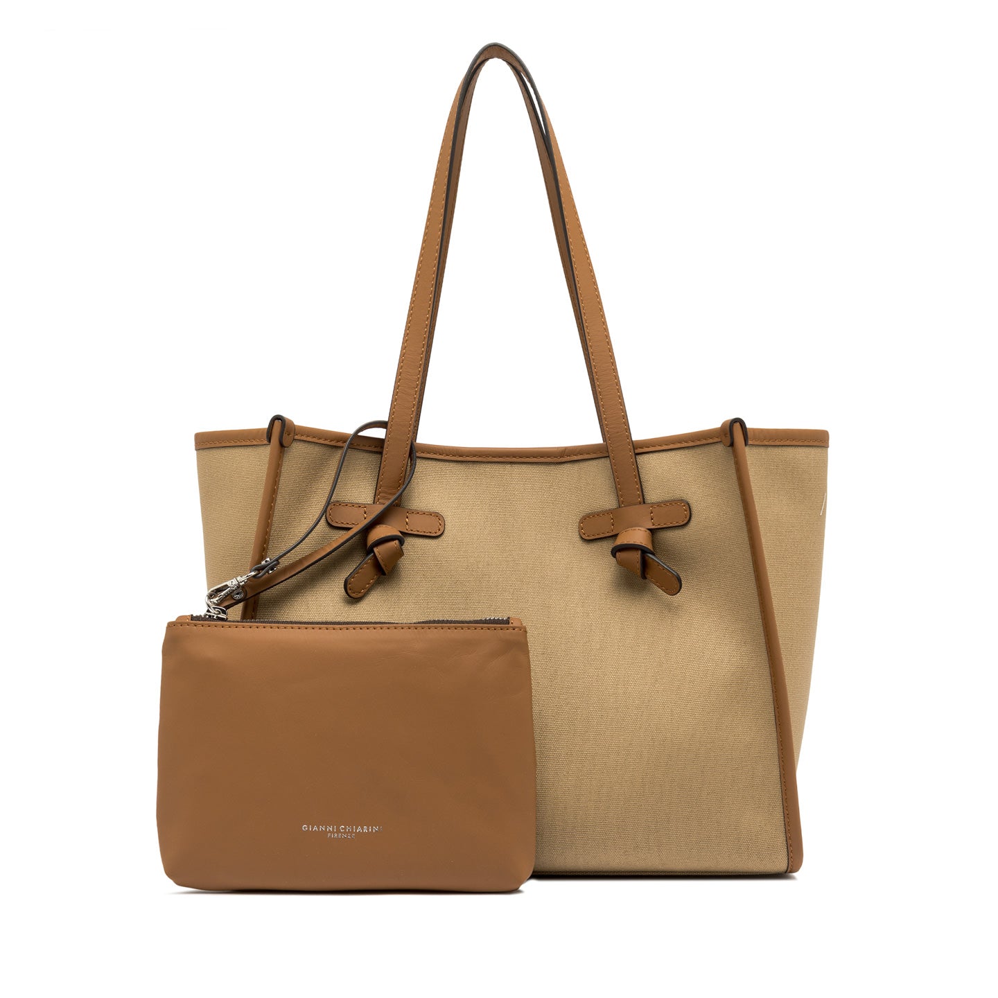 La shopping Marcella by Gianni Chiarini Firenze presenta una silhouette minimale e elegante, realizzata in tessuto canvas. Dotata di manici in pelle e chiusura magnetica, è perfetta per l'uso quotidiano. I profili in pelle aggiungono un tocco di classe, mentre la fodera interna e la pochette coordinata ne aumentano la versatilità, rendendola ideale per completare anche i look più semplici. Dimensioni: 33x25x13 cm.