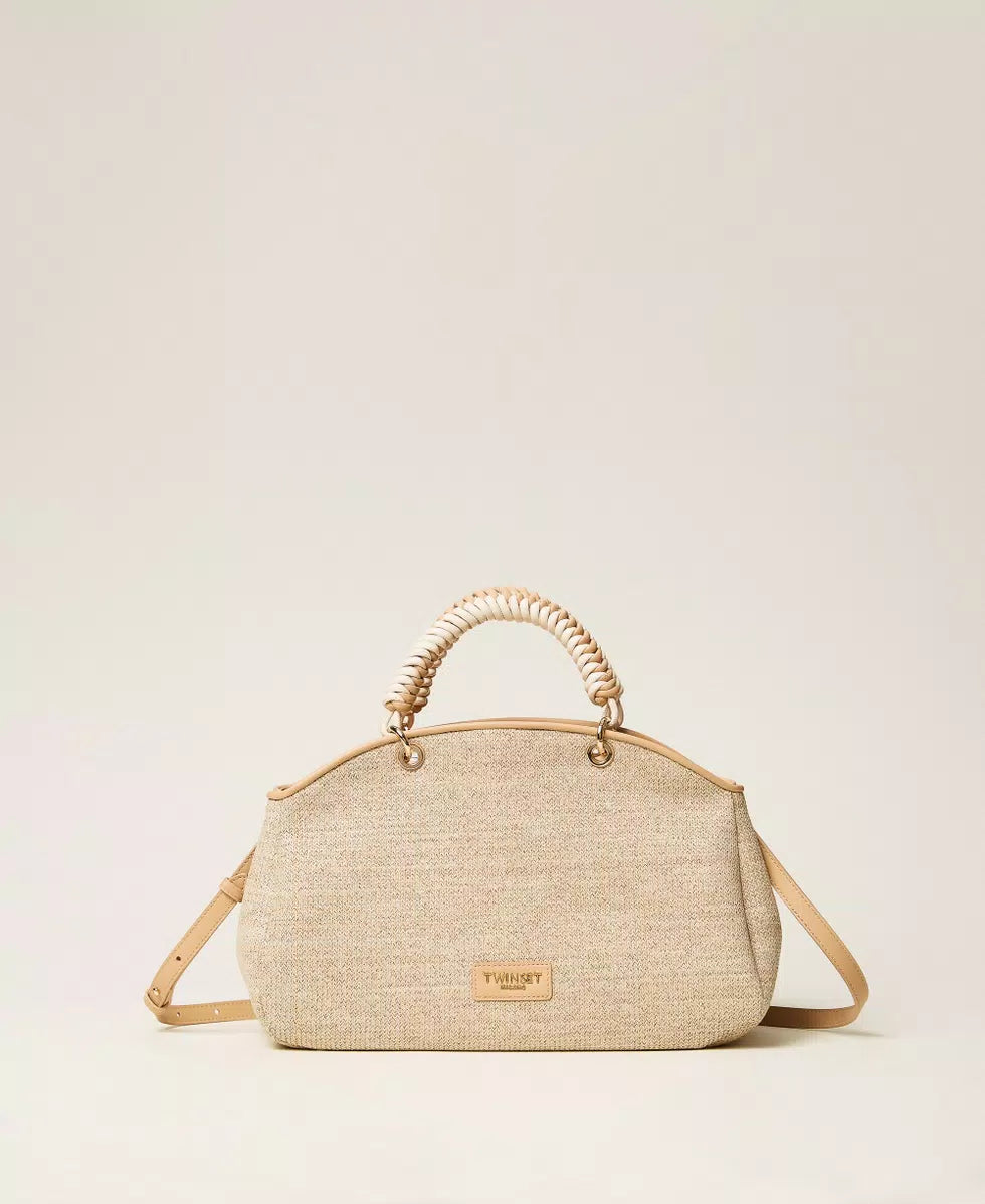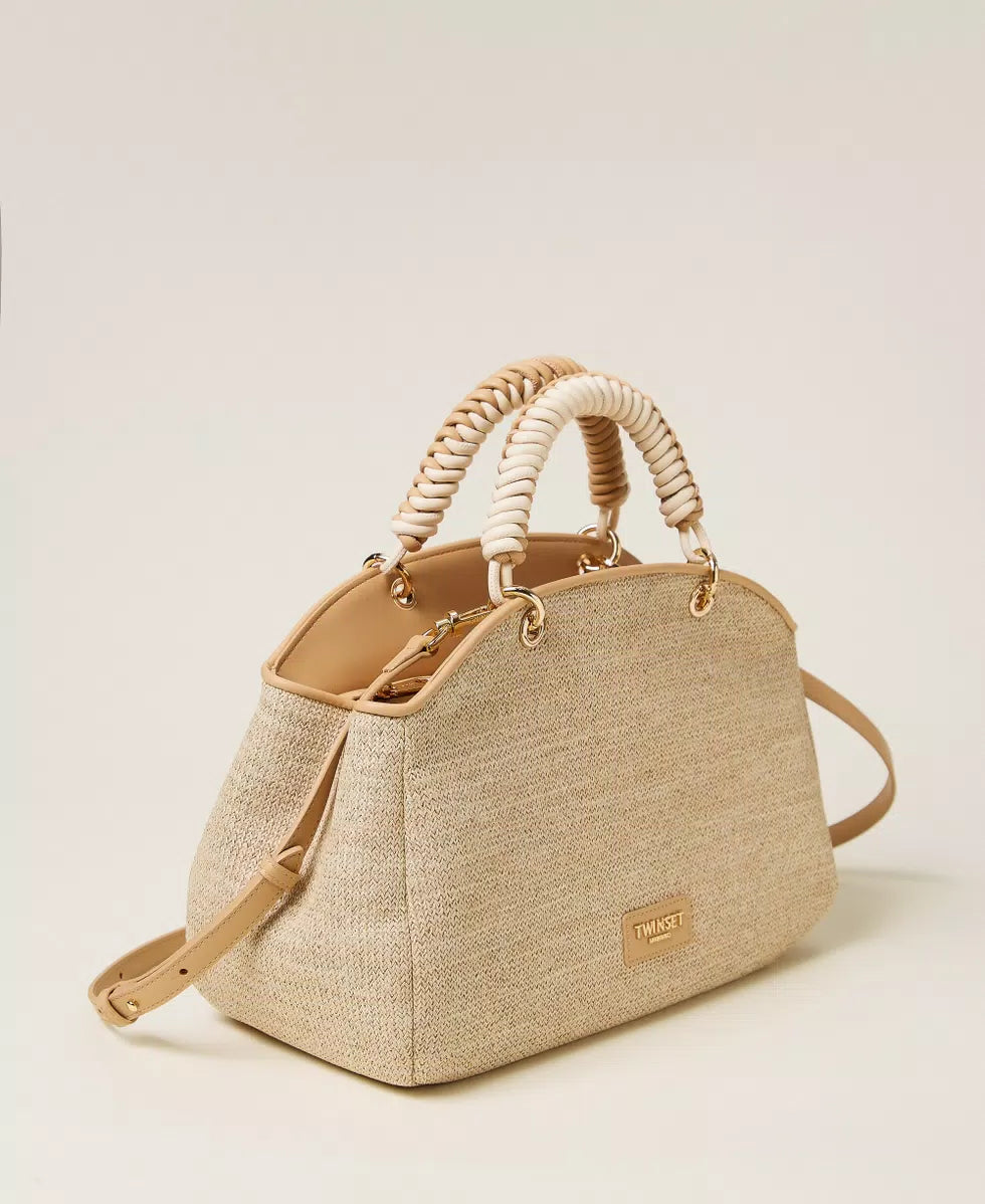 Borsa bauletto in tessuto effetto rafia con finiture aspetto pelle di vitello naturale. Ha doppio manico a mano intrecciato bicolore, tracolla cross-body rimovibile, chiusura con zip, logo stampato a caldo su etichetta effetto pelle di vitello, foderata.